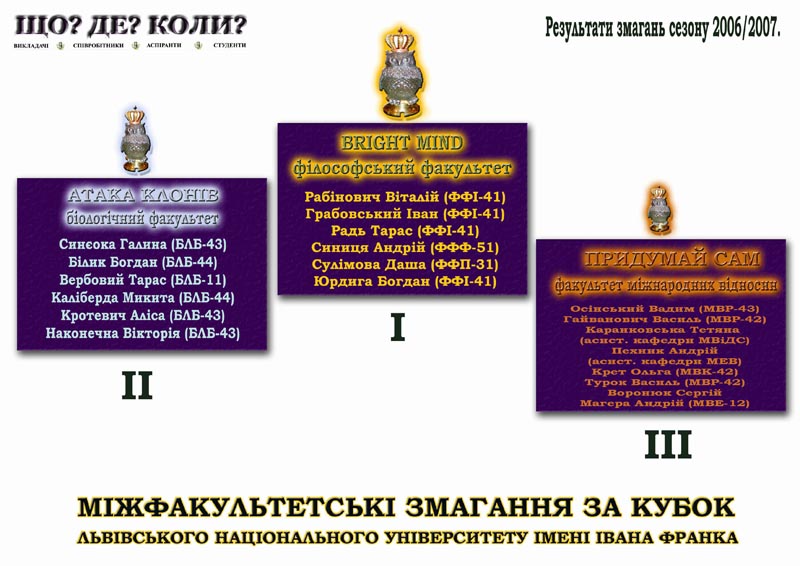 30 травня на факультеті електроніки відбувся заключний етап міжфакультетських змагань за кубок Львівського національного університету імені Івана Франка. Команда філософів «Bright mind» впевненою грою стримала «Атаку клонів» (біологічний факультет) і, здобувши свою четверту (!) перемогу у сезоні завоювала кубок Львівського університету зі спортивного «Що? Де? Коли?». Символічно, що капітан команди «Bright mind» Віталій Рабінович на жеребкуванні перед грою витягнув номер 1.
