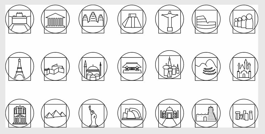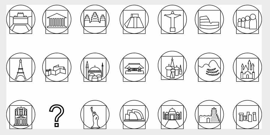 Коментар: на рисунку символічно зображені фіналісти конкурсу „Нові сім чудес світу” (серед них Акрополь, статуї о-ва Пасхи, Ейфелева вежа, Колізей, собор св.Софії в Стамбулі, Сіднейська опера, Тадж-Махал, Стоунхендж та інші). Переможці конкурсу будуть оголошенні 7.07.2007 року. Серед фіналістів присутні також піраміди з Гізи, що відомі як одне із семи чудес стародавнього світу.